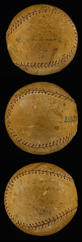 Description:Exceedingly rare 1916 Boston Red Sox team signed baseball with Babe Ruth (World Champions). Red and blue stitched Reach B.Johnson Official American League baseball has been signed by approximately (22) members of the World Series Championship team. While nearly all have largely faded, those which remain identifiable include Babe Ruth, Herb Pennock, Dutch Leonard, Carl Mays, Charles (Heinie) Wagner, Duffy Lewis, Jack Barry, Harry Hooper, Tillie Walker, Everett Scott, Larry Gardner, and George Foster. Technical grade of the signatures, as signed in period fountain pen, would range from 1 to 4/5 out of 10. Ball itself has evenly toned with a few scattered spots of discoloration and some light wear. Stampings remain bold and well defined. Of noted rarity this example is one of only a handful extant and the first we have offered at auction. Includes full LOA from JSA: See description