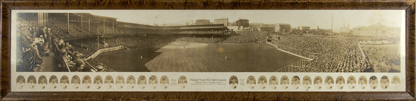Description:Rare 1925 Pittsburgh Pirates "World Champions" panoramic photograph - a sweeping scene from Forbes Field. Large sepia toned photograph showing a high vantage view of the play on field during Game (1) of the 1925 World Series in the fabled Pittsburgh venue. A composite of (30) oval portrait images of participants appear below and include Manager Bill McKechnie and his standout players Pie Traynor, Fred Clarke, Kiki Cuyler, and Max Carey. Marked "Trinity Court Studio" with titling and text at center. Housed in 14.75"x59.5" period frame with some light visible scattered wear largely taking the form of toning and some mildly more pronounced flaws at right end. A magnificent period piece which is among the more sought after and highly regarded of its type: EX