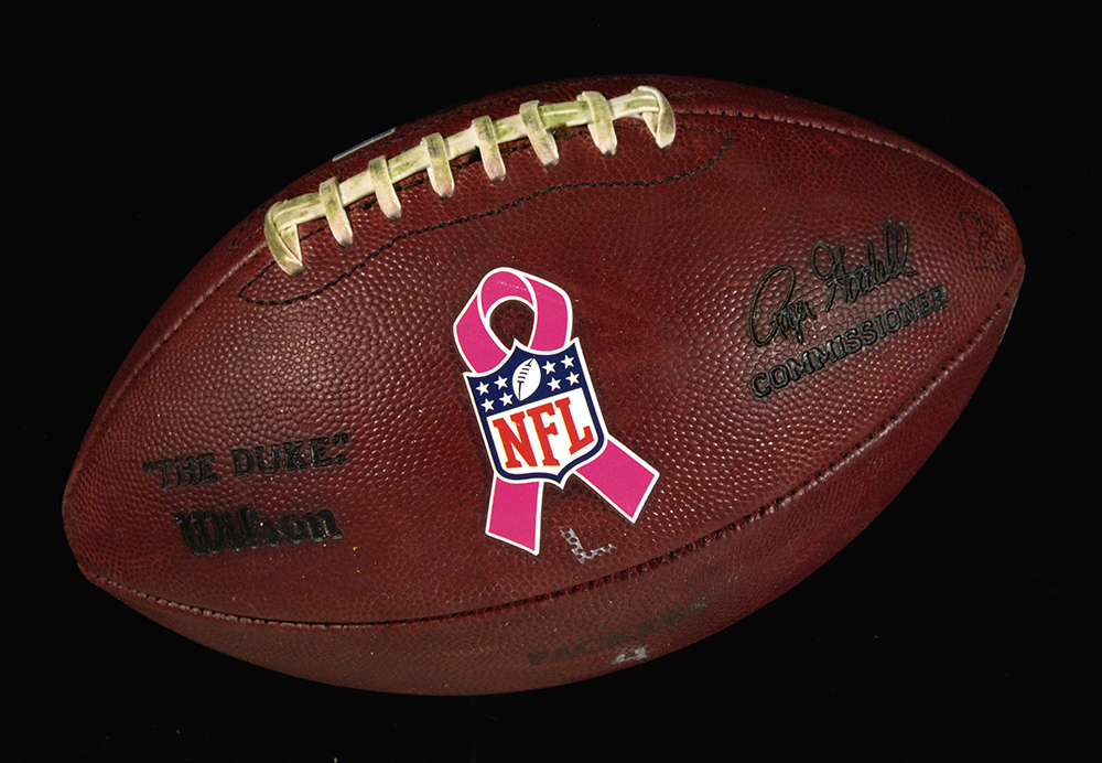 Description:10-9-2016 New York Giants at Green Bay Packers game used football from Breast Cancer Awareness game. Wilson "The Duke" NFL football featuring the cancer awareness logo with "PACKERS" branded below, along with various official's markings in black or silver marker. Includes NFL Auctions COA from PSA/DNA, with matching serial #ed sticker affixed to the ball. The Packers won the game by a score of 23-16, and the ball shows strong use with grass stains on the laces: EX