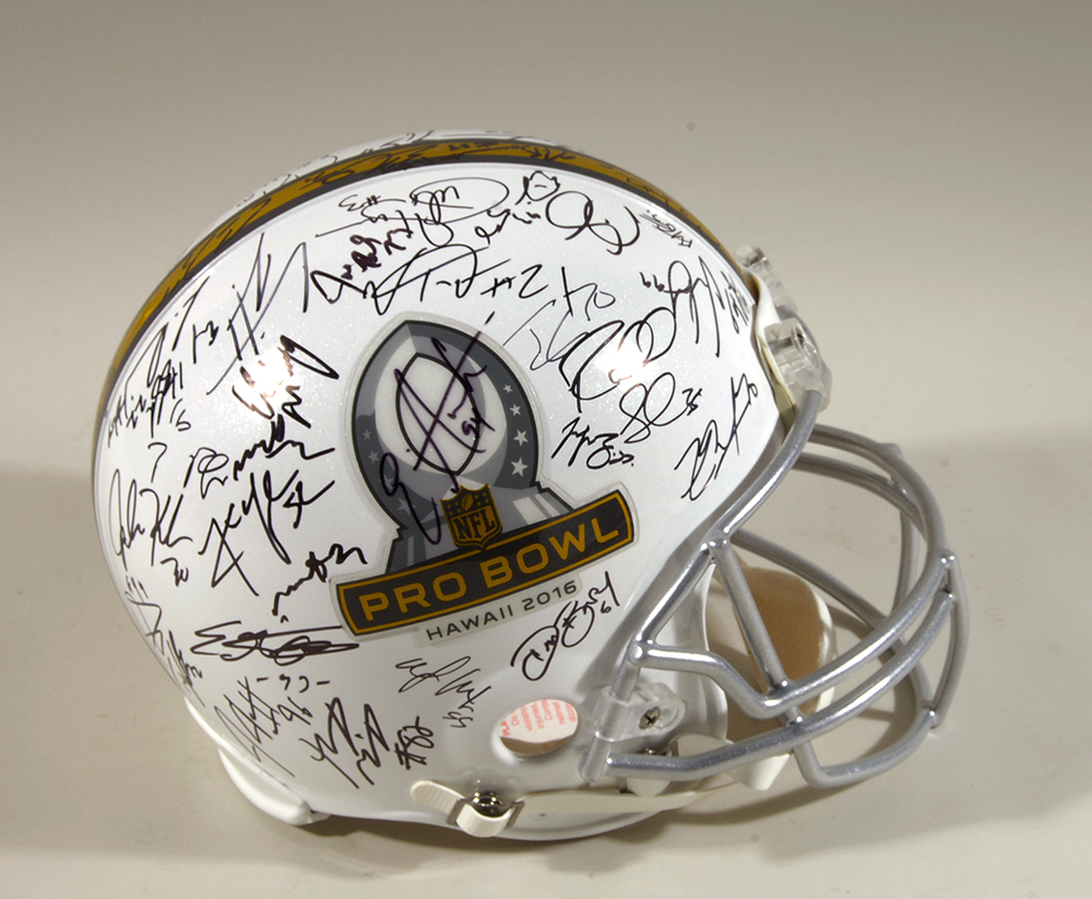 Description:Multi-signed 2016 Pro Bowl helmet with approx. (65) autographs. Riddell VSR4 full size 2016 Pro Bowl helmet signed by Todd Gurley, Aaron Donald, Sean Lee, Teddy Bridgewater, Eli Manning, Jameis Winston, Richard Sherman, Tyler Lockett, Doug Martin, Khalil Mack, Gerald McCoy, NaVorro Bowman, Ezekiel Ansah, Derrick Johnson, and many others. Includes NFL Auctions COA from PSA/DNA, with matching serial #ed sticker affixed to the helmet: NM/MT