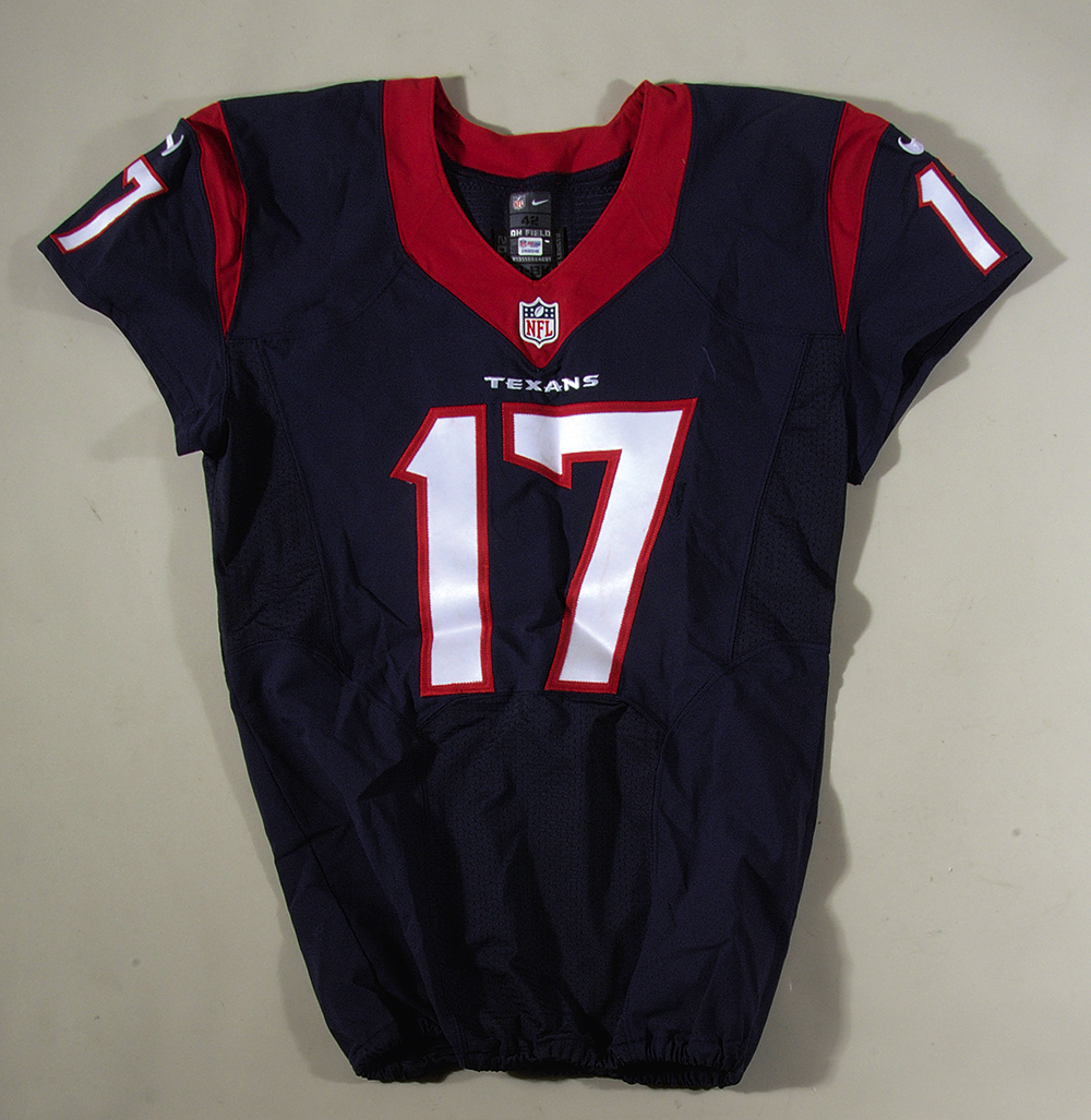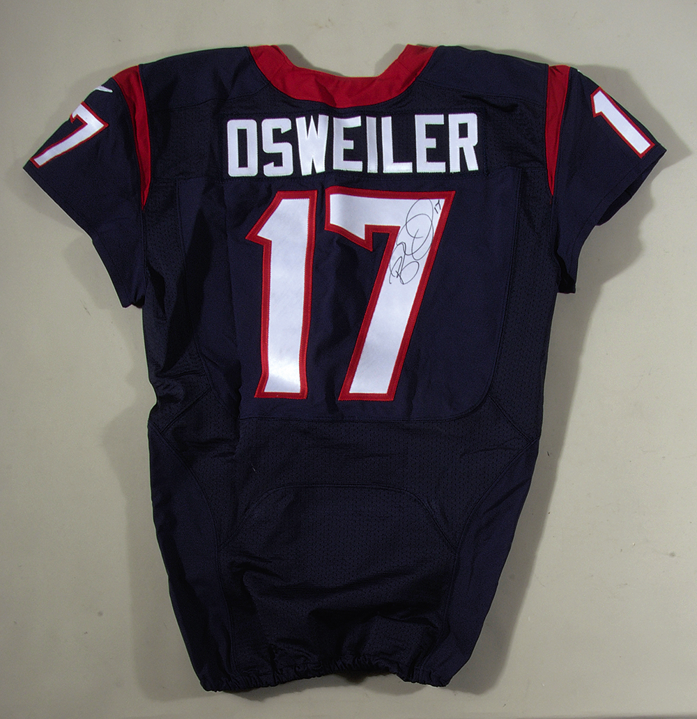 Description:Brock Osweiler autographed 10/16/2016 game worn Houston Texans jersey. Nike size 42 Texans #17 Brock Osweiler jersey worn during Breast Cancer Awareness game against the Colts. Osweiler signed the jersey in black marker. Includes NFL Auctions COA from PSA/DNA, with matching serial #ed sticker affixed to the jersey. Osweiler threw for 269-yards and 2-TDs in the game. The jersey shows visible use with light stains, and a team repair on the front (likely indicating that it was also worn in previous games): EX