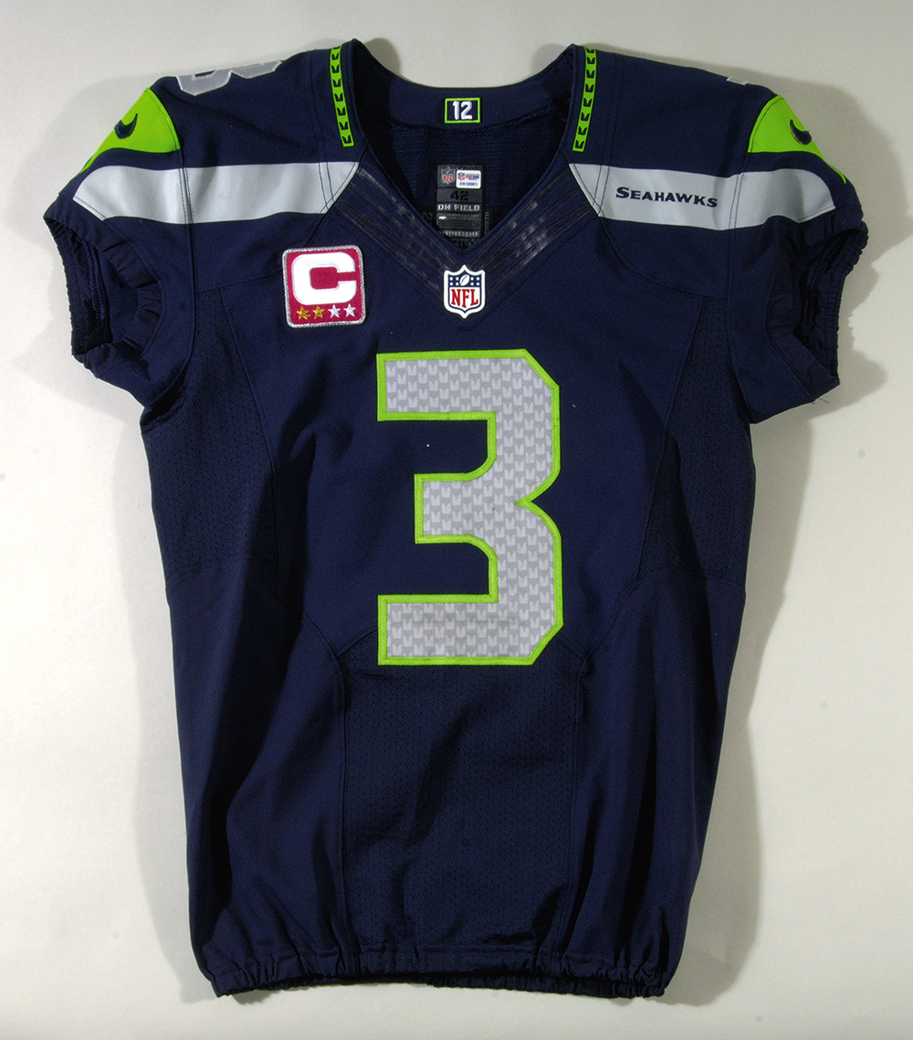 Description:Russell Wilson 10/12/2014 game worn Seattle Seahawks jersey with pink Captain patch. Nike size 42 Seahawks #3 Russell Wilson jersey worn during Breast Cancer Awareness game against the Dallas Cowboys. Includes NFL Auctions COA from PSA/DNA, with matching serial #ed sticker affixed to the jersey. Wilson passed for 126-yards, and added a rushing TD in the game. The jersey shows impressive use, with large areas of light staining on the back. Uncommon offering from one of the elite quarterbacks in the game today: EX