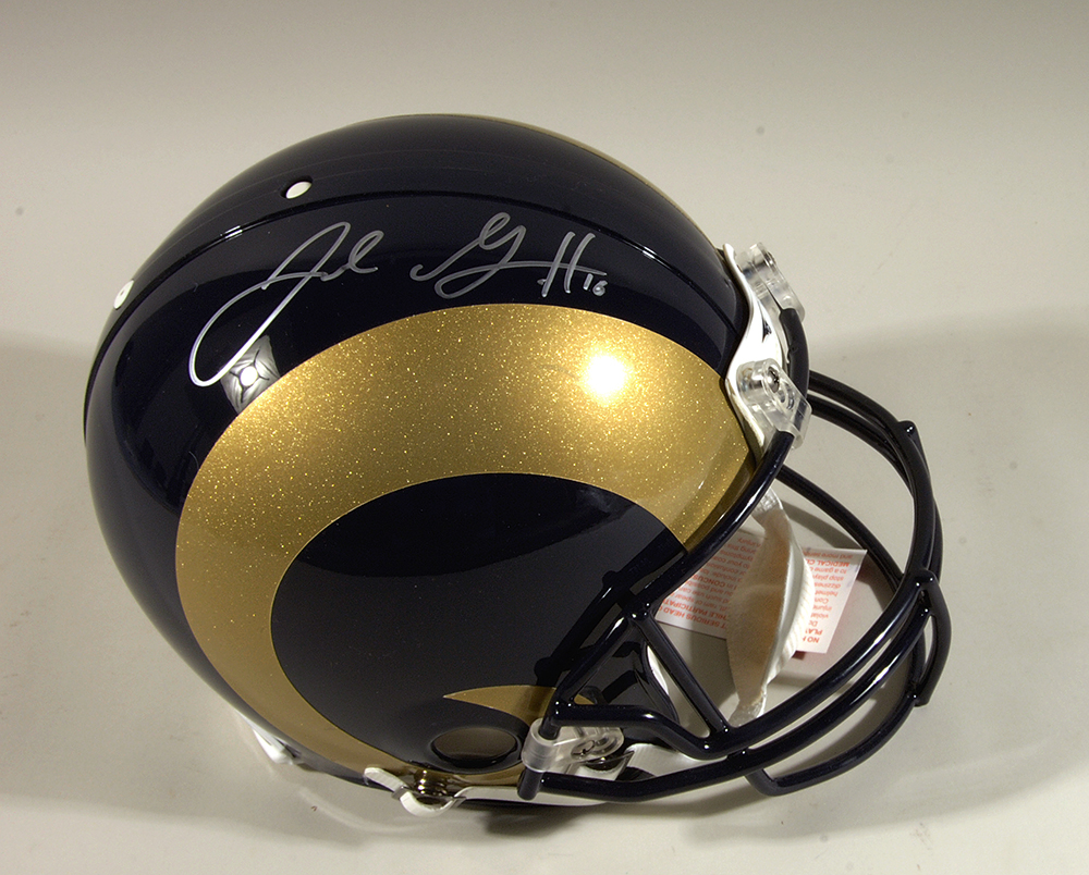 Jared Goff autographed Los Angeles Rams full size helmet. Riddell VSR4 Pro Line helmet signed by Goff in silver marker. Includes NFL Auctions COA from PSA/DNA, with matching serial #ed sticker affixed to the helmet: NM/MT