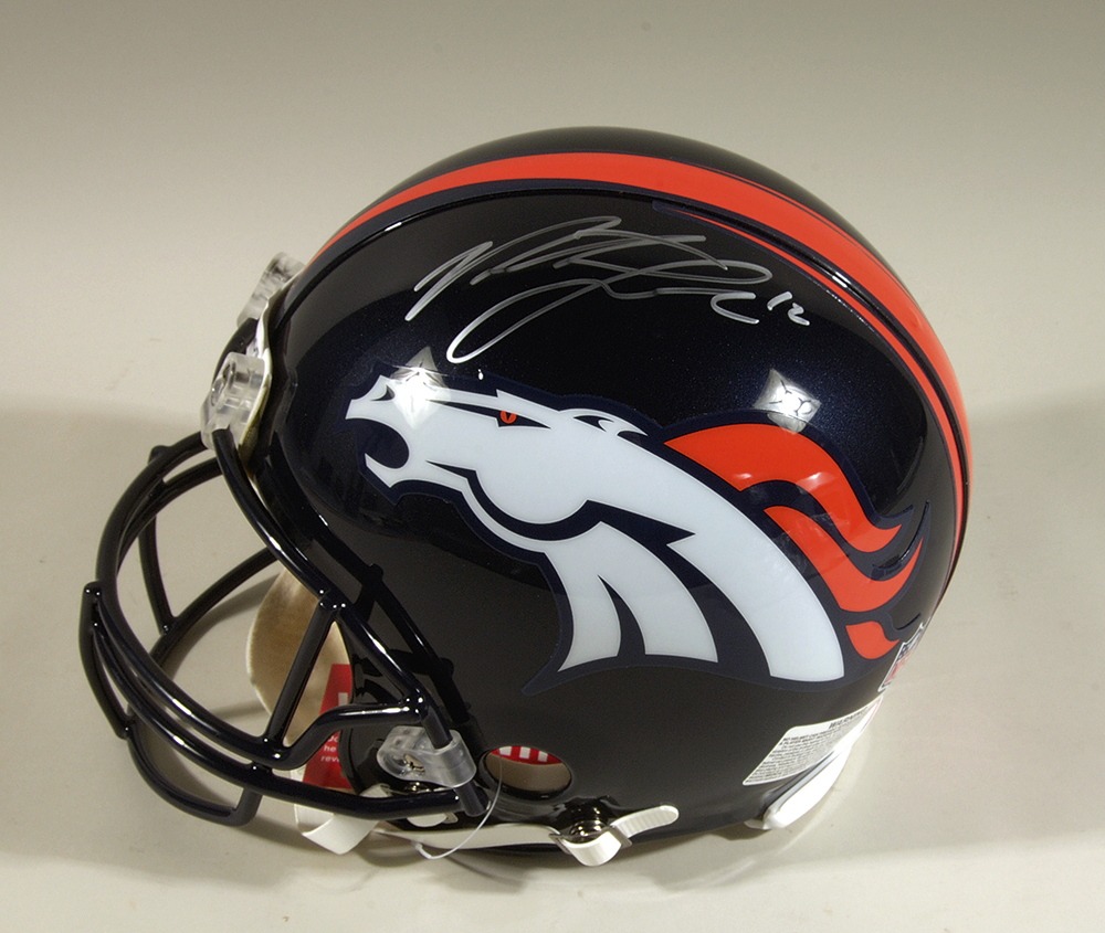 Paxton Lynch autographed Denver Broncos full size helmet. Riddell VSR4 Pro Line helmet signed by Lynch in silver marker. Includes NFL Auctions COA from PSA/DNA, with matching serial #ed sticker affixed to the helmet: NM/MT
