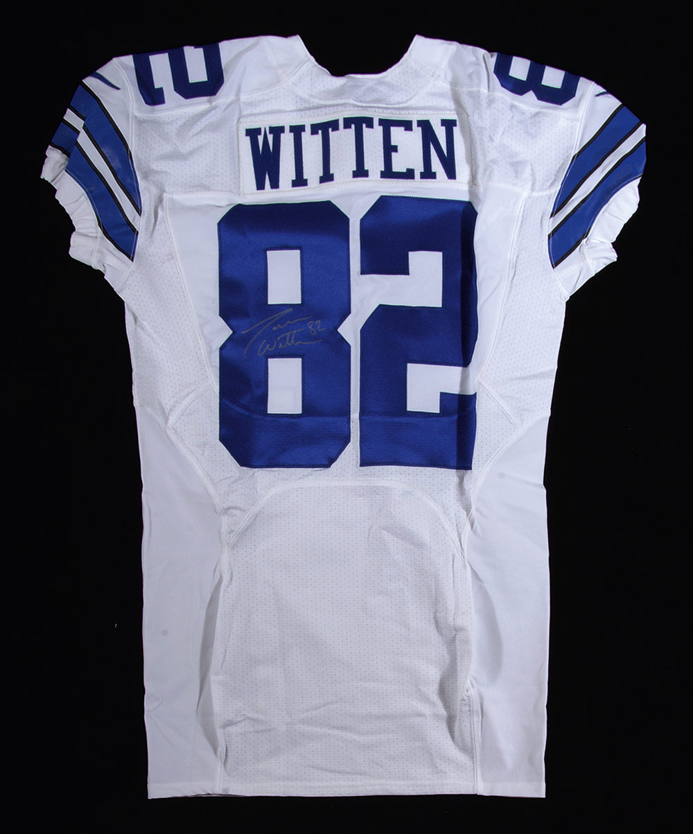 Description:Jason Witten autographed 2016 Dallas Cowboys professional model jersey. Nike size 44 Cowboys #82 Jason Witten jersey with proper 2016 On Field tagging inside the collar. Witten signed the jersey in silver marker. Includes NFL Auctions COA from PSA/DNA, with matching serial #ed sticker affixed to the jersey. Appears unused, with no mentionable wear: NM