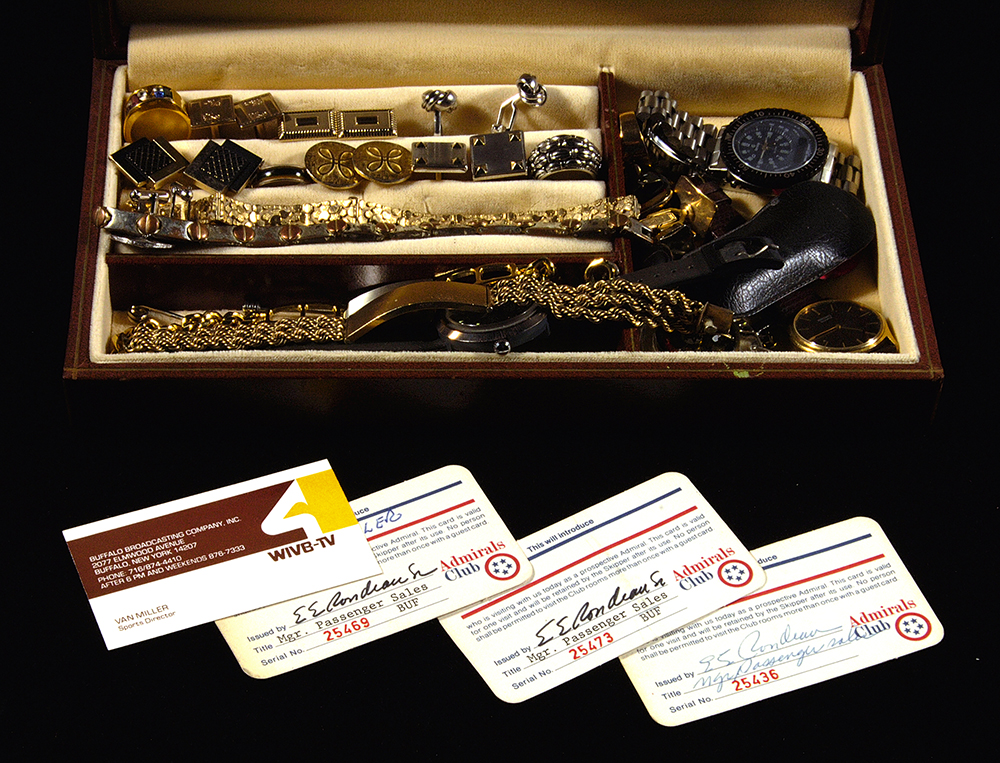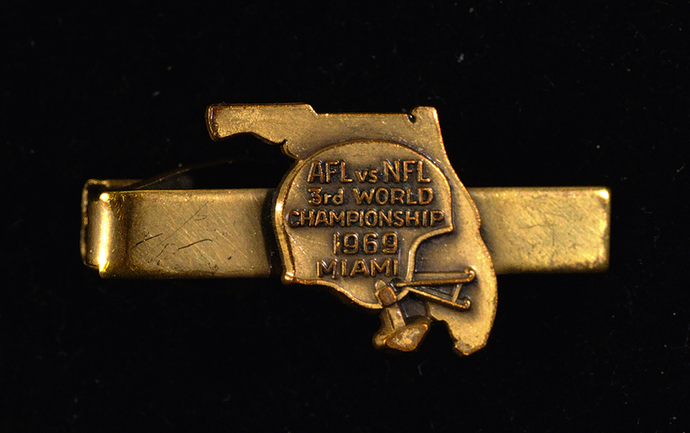 Description:1969 Super Bowl III press tie clasp with additional gentlemans' accessories from the Miller Collection. Includes 1969 Jets vs. Colts Super bowl III press pin tie clip (hint of tarnish/wear); Seiko wristwatch which has "Van With Love 12-25-77" engraved on back; Rotary Club "Paul Harris Fellow" pin and medallion in presentational box; large "Texas" belt buckle; jewelry box containing an assortment of bracelets (4), watches (2), cufflinks, rings, tie-clips/tacks, pocket knife, and similar type items; (3) of Miller's American Airlines Admirals Club cards; a number of his personal business cards in holder; . Varying degrees of use/wear throughout. Includes letter of provenance from the Miller Family: GD-NM