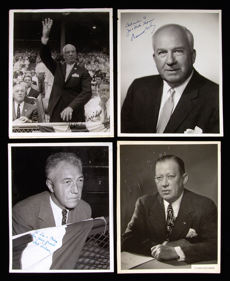 Description:Hall of Fame Executives autographed 8"x10" photos (4) incl. MacPhail and Harridge (Sigs. EX/MT-NM) Lot of (4) signed 8"x10" black and and white photographs incl. William Harridge, Larry MacPhail (on Fabian Bachrach marked image), Ford Frick (Wingfield marked photo), and Warren Giles. All except Harridge are personalized with fountain pen and ink signatures rating 7/8-9 out of 10. All have mild/moderate scattered wear which is the result of prior mounting within a scrapbook (Frick with small tear at upper left). Includes auction LOA from JSA: Sigs. EX/MT-NM