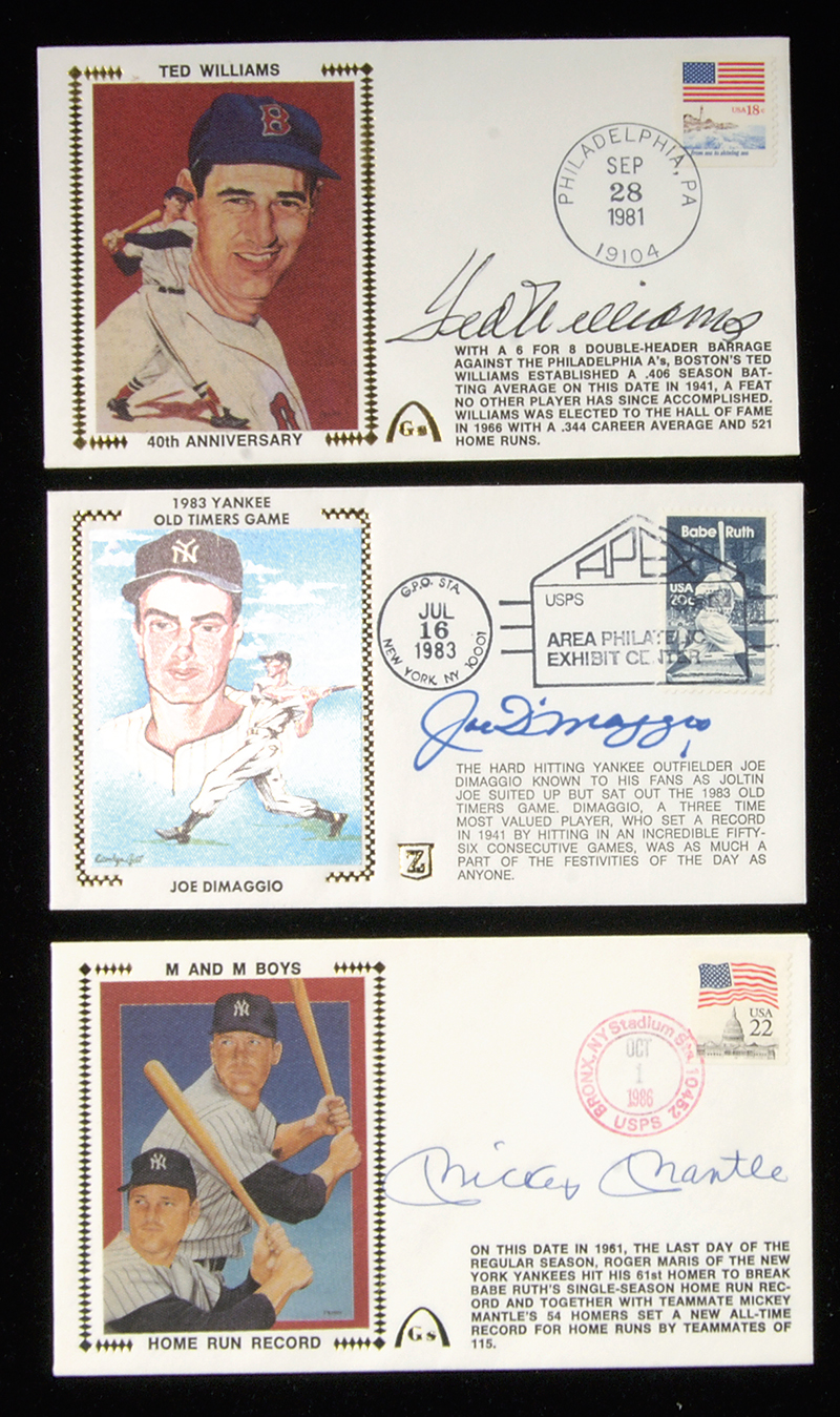 Mickey Mantle, Ted Williams, and Joe DiMaggio autograph postal covers (NM) Trio of commemorative covers, each signed in ink or marker rating 8-8/9 out of 10. Includes auction LOA from JSA: NM