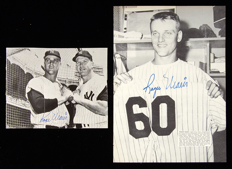 Description:Lot of (2) Roger Maris autographed publication page photographs (Sig. NM) Includes approx. 6"x7" image of Maris with Mickey Mantle and 8"x11" image of Maris just after hitting his 60th homerun in 1961. Both are signed "Roger Maris" in blue marker rating 8 out of 10. Each has light fold lines from mailing and a touch of other light scattered wear. Includes auction LOA from JSA: Sigs. NM