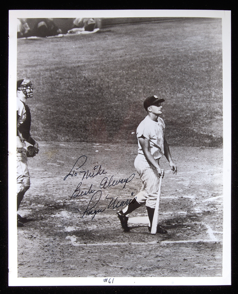 Description:Roger Maris autographed 8"x10" photograph (Sig. NM) Signed "To Mike, Best Always, Roger Maris" in marker rating 8/9-9 out of 10. Touch of light scatterd wear to photo which has mounting residue on back. Includes auction LOA from JSA: Sig. NM