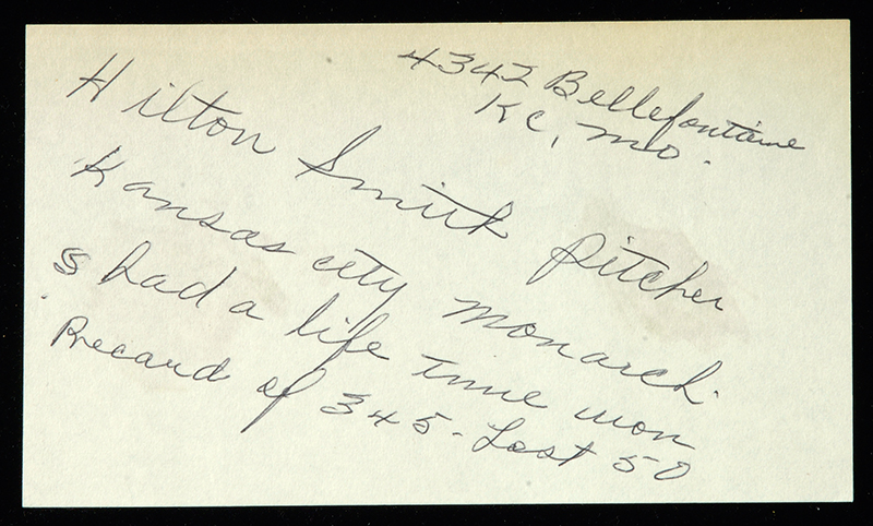 Description:Hilton Smith autograph with career record inscribed (NM) Slip of paper (approx. 3"x5") has been signed "Hilton Smith" and inscribed, "pitcher Kansas City Monarchs" along with his record of (345) wins and only (50) losses. All done in ink rating 8 out of 10. Touch of light toning with a pair of small spots of mounting residue on back. Includes auction LOA from JSA: NM