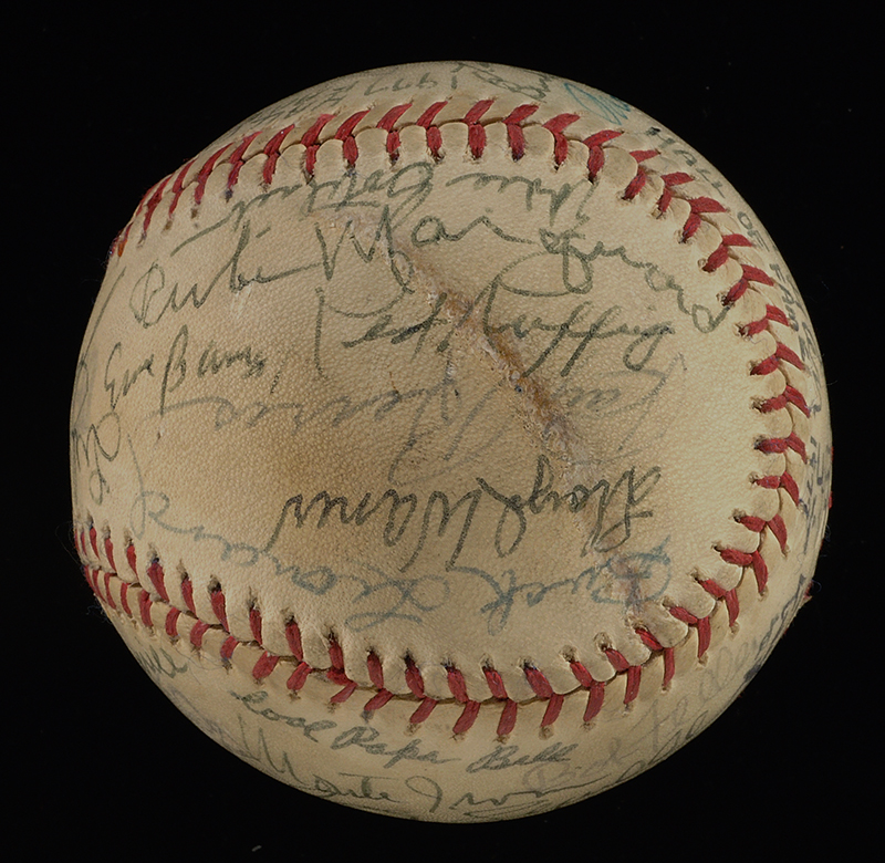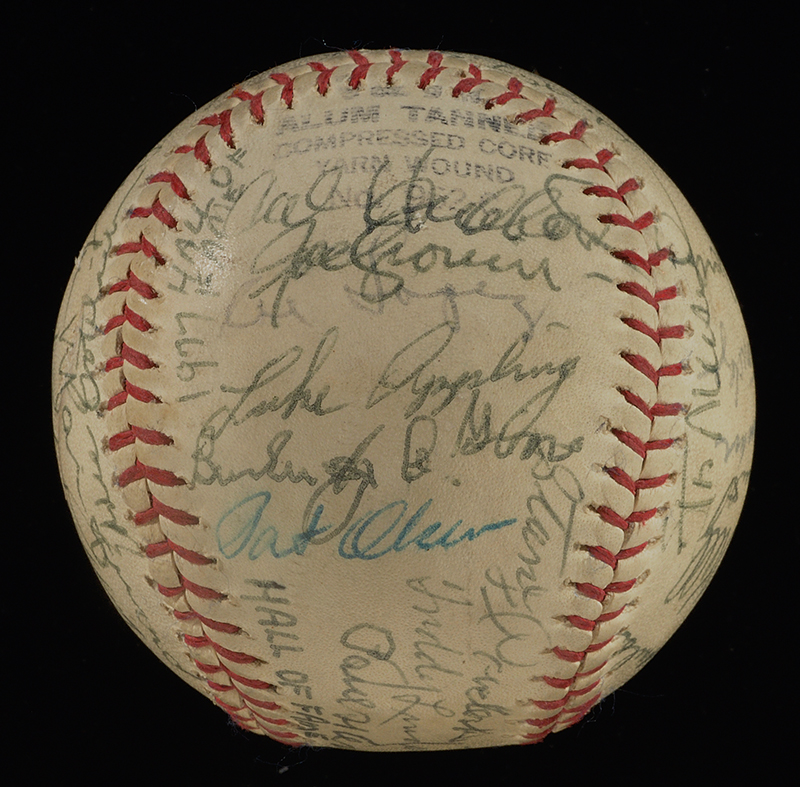 Description:Hall of Famers and notables autographed baseball c.1977 (26 HOFers) (EX-EX/MT) Vintage "Official League" baseball with "Hall of Fame 1977" notation on sweetspot has been signed throughout by a total of (36) Hall of Famers and other notables. Signers incl. Cool Papa Bell, Joe Cronin, Burleigh Grimes, Stan Coveleski, Fred Lindstrom, George L. Kelly, Cal Hubbard, Red Ruffing, Lloyd Waner, Buck Leonard, Ernie Banks, Rube Marquard, Bill Terry, Stan Musial, Lloyd Waner, and others. A Campanella signature is secreterial. All are done in ink rating 6/7-8 out of 10. Mild toning/soiling to to ball which a scuff/scrape on (1) panel. Includes auction LOA from JSA: EX-EX/MT