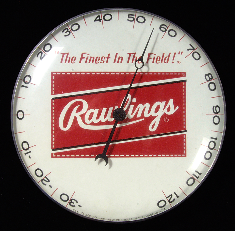 Description:Rare c.1960s Rawlings advertising thermometor (EX/MT) Period piece having a large Rawlings logo at center with their "Finest In The Field" slogan above. Marked "Pam Clock Company" along the lower edge with just a touch of light natural age and handling wear. 12" Across. The first example we have seen or offered: EX/MT