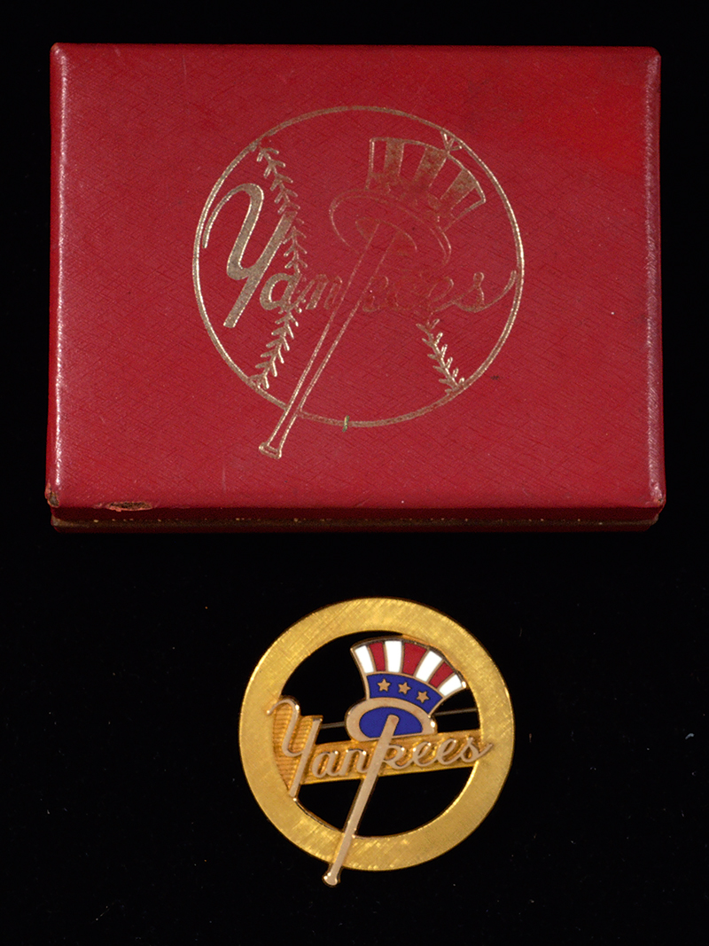 Description: New York Yankees broach pin with original leather box by Balfour c.1950-60s. 10K gold filled broach pin having inset Yankees insignia with red, white, and blue enamelwork. Retains its original hinged lid red leather box having Yankees logo in silver on exterior lid: NM