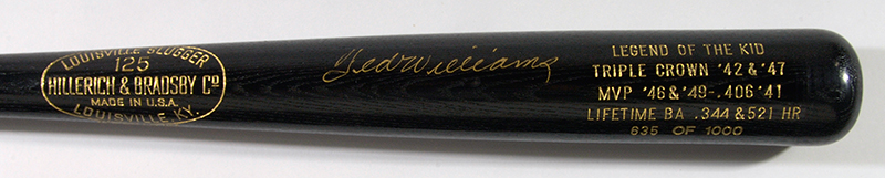 Description:Ted Williams autographed limited edition "Legend of The Kid" commemorative baseball bat (NM) Louisville Slugger 125 model baseball bat done in black finish has been gold foil stamped in the barrel with "Legend of The Kid" titling and career related stats. Limited edition numbered 635 of 1000. Signed in gold marker rating 8-8/9 out of 10. One of a very limited number from the edition which have been publicly released. Includes auction LOA from JSA and there is a "Ted Williams Trust" hologram on the knob: NM