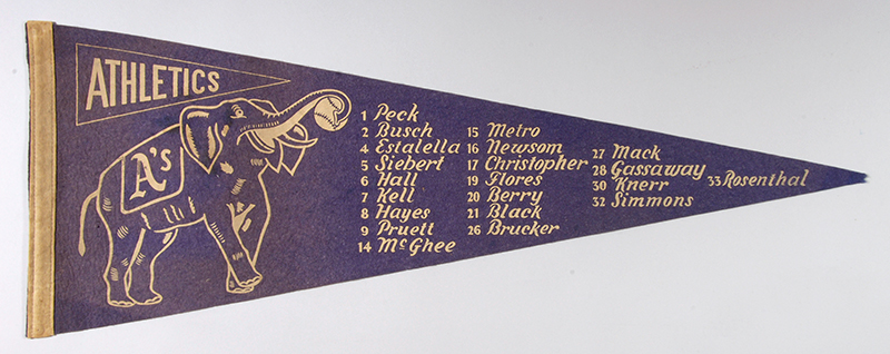 Philadelphia Athletics souvenir pennant c.1944. Royal blue pennant with trademark Athletics' elephant mascot having player names across the front. Pinholes at corners and minor loss to the point: EX