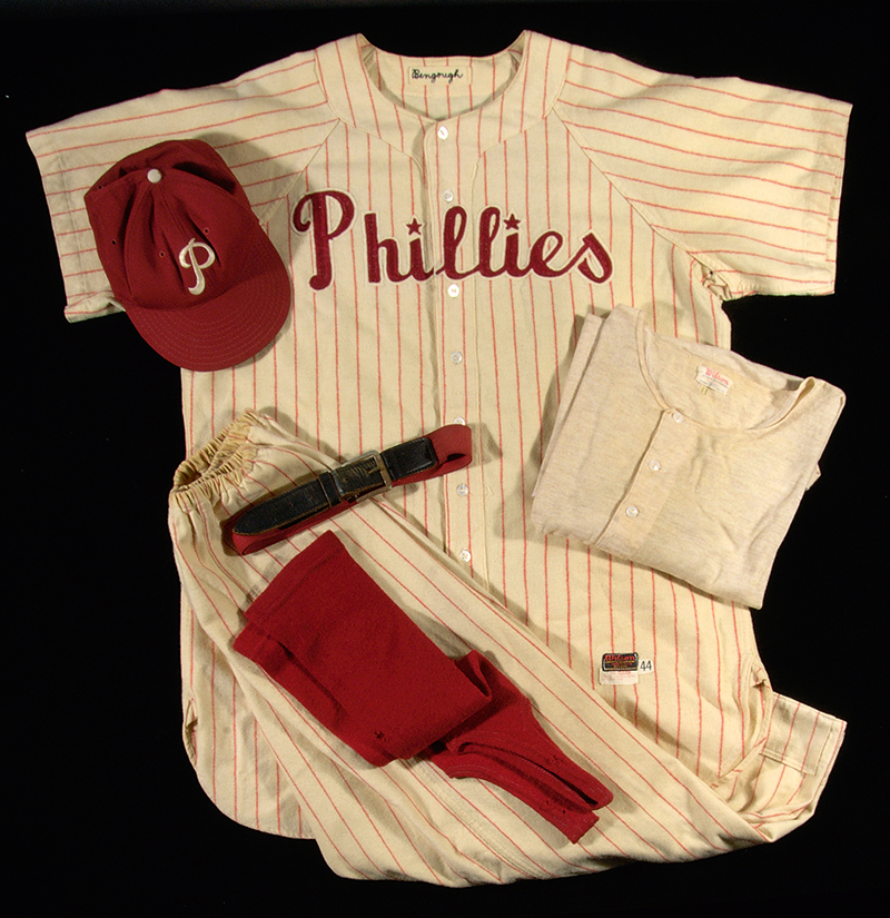 Description:-Rare 1950 Bennie Bengough Philadelphia Phillies complete home uniform with World Series attribution. Very fine intact set to include home pinstriped jersey, pants, hat, undershirt, belt, and stirrup socks as worn by Phillies coach Bennie Bengough. The jersey and pants remain in superb original condition retaining proper Wilson mfg. tagging along with proper -Bengough+ chain stitched strip tagging. Philiies professional model hat included with Wilson tagging on the interior. Based on comparison to additional Phillies uniforms as documented to have been used in the 1950 World Series the offered set is identical in every respect inclusive of specific tagging and shirt style. This specimen base includes Richie Ashburn+s 1950 World Series jersey which is housed within the collection of the Baseball Hall of Fame. Outstanding period- uniform with highly desirable World Series attribution. Includes LOA from Hunt Auctions: EX-EX/MT