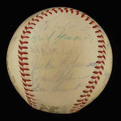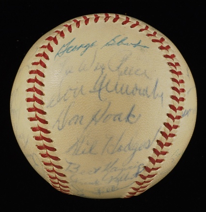 Description:1955 Brooklyn Dodgers team signed baseball (World Series Champions) (Sigs. EX, Ball EX/MT-NM) Spalding W.Giles Official National League baseball has been signed by (27) incl. Robinson, Lasorda, Reese, Hodges, Newcombe, Hoak, Hamric, Kellert, and Spooner. Alston is clubhouse. Ink signatures rate 6/7 to 7 out of 10. Ball displays light even toning with well defined stampings. Includes auction LOA from JSA: Sigs. EX, Ball EX/MT-NM