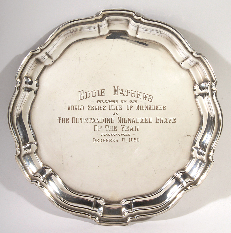 Description:1959 Eddie Mathews "Outstanding Milwaukee Brave Of The Year" award (EX/MT) Metal presentational platter (14.25" across) has been engraved, "Eddie Mathews, Selected By The World Series Club Of Milwaukee As, The Outstanding Milwaukee Brave Of The Year, Presented December 9, 1959." Marked "Poole Silver" on back with a hint of light natural tarnish/wear: EX/MT