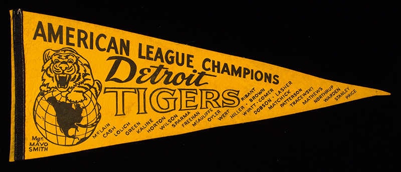 1968 Detroit Tigers AL Champions souvenir pennant. Uncommon yellow pennant with Tiger graphic at left end and player names across the front: EX-EX/MT