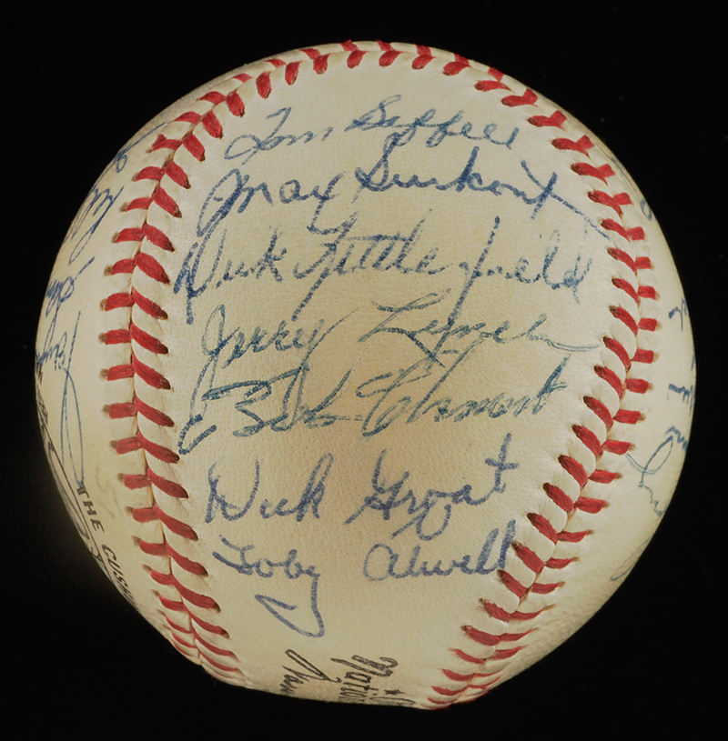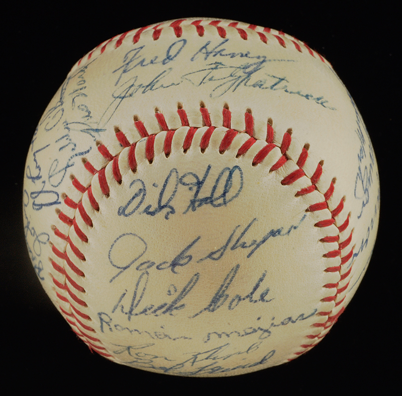Description:High grade 1955 Pittsburgh Pirates team signed baseball with Rookie Clemente (NM) Spalding W.Giles Official National League baseball has been signed by (25) incl. Clemente, Haney, Long, Thomas, Groat, Friend, Law, and others. Ink signatures rate 8-8/9 out of 10. Ball displays light even toning with no mentionable wear and has errant "1956" ink notation written on. Includes letter of provenance from Vern Law and auction LOA from JSA: NM