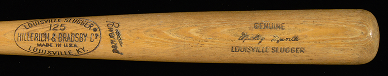 Description:Mickey Mantle post-career professional model baseball bat c.1969-72 (EX) Lousville Slugger 125 model bat with Mantle facsimile signature burned into the barrel measures 35" long and weighs 36.6oz. Model number "K55" has been factory stamped in the knob which has a vintage player number notation (appears to read "35"). Strong usage wear evident throughout. The bat appears to match records for a batch of (4) which are listed as being sent to Mantle in 1971. Includes LOA from Hunt Auctions: EX