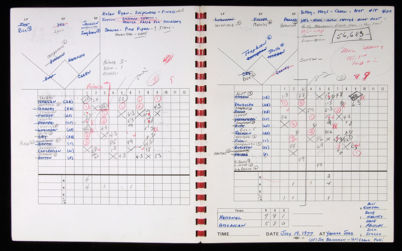 Description:July 19, 1977 All-Star Game scoresheets from Joe Garagiola (EX/MT-NM) Pair of heavy stock original scoring sheets as kept by the Hall of Fame Announcer as he called the game which took place at Yankee Stadium. Won by the National League 7-5, notable participants included Bench, Rose, Seaver, Carew, Winfield, Brett, Munson, Yastrzemski, and Fisk. Touch of light natural handling wear: EX/MT-NM