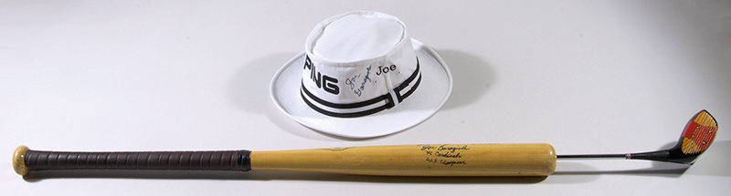 Description:Joe Garagiola autographed custom baseball bat golf club and hat (EX-NM) Includes Adirondack Joe Garagiola signature model fungo bat which has been fitted at barrel end with a Ben Hogan model driver head. The bat/club shows a touch of light wear and has been signed and inscribed to reflect the Cardinals 1946 World Series Championship; Ping golf hat with "Joe" embroidered in the side and signed "Joe Garagiola." Marker signatures rate 8 out of 10. Includes COA from PSA/DNA (for club) and auction LOA from JSA: EX-NM