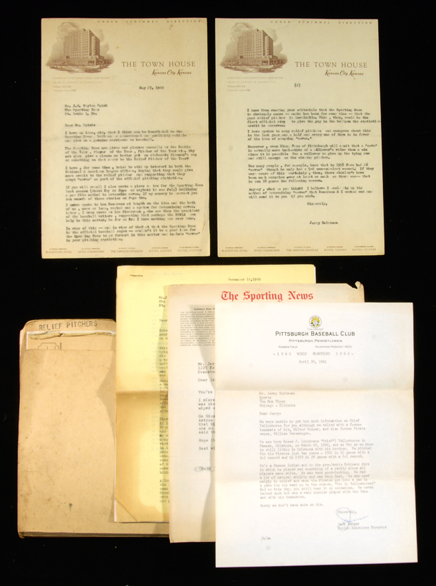 Description:Historically significant Jerome Holtzman file related to the "saves" statistic he is credited with creating. Although the term had been loosely used in the decade before, in 1960 Jerome Holtzman concieved of a more statistically sound method for recording "saves". Adopted, at his urging, by noted Sporting News publisher J.G. Spink, the pair ran the numbers in his weekly newspaper for (9) years. In 1969, the "save" was officially adopted by Major League Baseball. Presented is an intact file, as found within the Holtzman Archive, which appears largely to relate to his work on saves. Most notable is a May 27, 1960 file copy typed letter from Holtzman to Spink in which he first introduces and promotes further use of the save. Found throughout are his typewritten notes (some recording stats, one titled "system for pitching saves"), some handwritten notes, correspondence between he and Spink or The Sporting News, several other letters, publication clippings/articles, etc. Includes letter of provenance from the Holtman family from the initial offering of his collection: EX