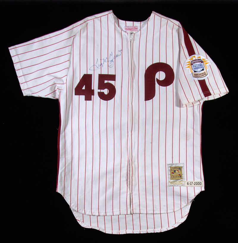 Description:2000 Tug McGraw Philadelphia Phillies autographed home jersey worn in the 1980 World Championship 20th Reunion Ceremonies. Mitchell & Ness pinstriped white home knit jersey as worn by McGraw during the 1980 World Series Champions reunion held on June 17, 2000 at Veteran's Stadium. Jersey is signed across the front by McGraw in blue sharpie and retains "6-17-200" chain stitched strip tag on tail. Includes auction LOA from JSA (autograph) and LOA from Hunt Auctions (jersey): EX-MT