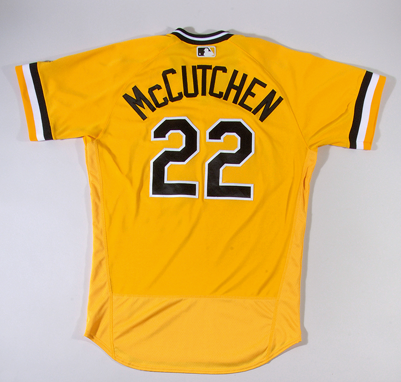 Description:2016 Andrew McCutchen Pittsburgh Pirates game used jersey (MLB Auth) (EX) Yellow alternate jersey has "Pirates 22" on front and "McCutchen 22" on the back. Majestic tag screened on front tail notes size (42) and there is an addition team inventory tag below. MLB Authentication hologram affixed which confirms use during the 2016 season: EX