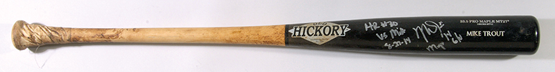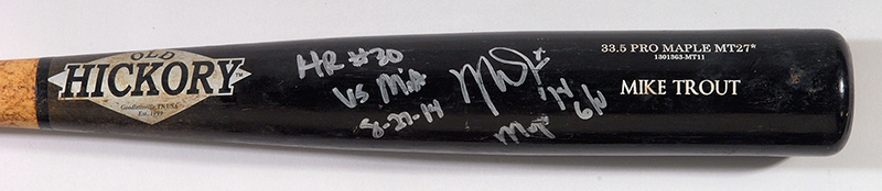 Description:August 27, 2014 Mike Trout Home Run #30 game used and autographed bat (PSA/DNA graded "GU 10") (Bat EX, Sig. EX/MT-NM) Old Hickory model MT27 bat with "Mike Trout" name block lettered on the barrel measures 33.5" long and weighs 32.9oz. Uncracked with evidence of outstanding use including ball, stitch, and cleat marks throughout the barrel. The handle has been tape wrapped for grip and a generous coat of pine tar remains in place. Signed on the barrel in silver marker rating 7-7/8 out of 10 and inscribed, "HR #30 vs. MIA 8/27/14" along with "MVP" and "G/U." Includes full LOA from PSA/DNA with assigned "GU 10" grade and there is an Anderson Authentics hologram affixed: Bat EX, Sig. EX/MT-NM
