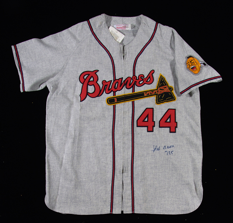 Hank Aaron autographed Milwaukee Braves replica jersey. Fine quality Mitchell & Ness grey flannel jersey signed by Aaron across the front in blue sharpie. Includes basic COA from JSA: NM