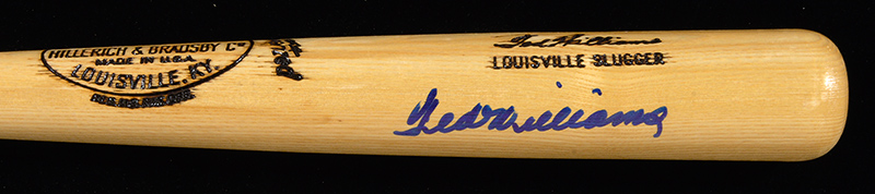 Description:Ted Williams autographed baseball bat. Louisville Slugger 125 model W166 bat done in similar style to that which he would have used has Williams facsimile signature burned into the barrel. Signed "Ted Williams" in bold blue marker rating 9/10 out of 10. Includes auction LOA from JSA and there is a "Ted Williams Trust" hologram on the knob: NM