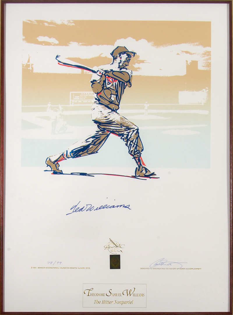 Description:Ted Williams autographed limited edition serigraph. Appealing large format print has been signed "Ted Williams" in blue marker rating 9/10 out of 10. Also signed by the artist Carlo Beninati and numbered "78/99." Tastefully matted and framed for display to measure 31.5"x39.5" overall. Includes auction LOA from JSA: NM