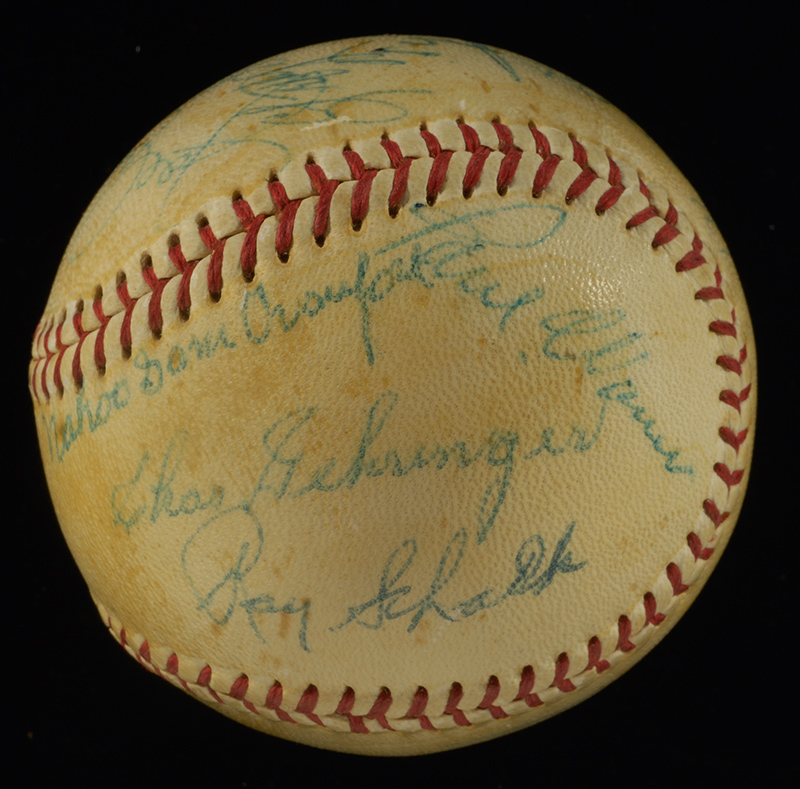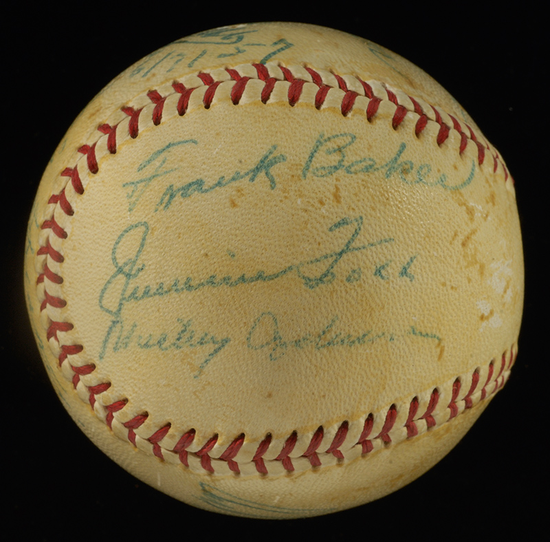 Description:1957 Hall of Fame ball with (12) autographs including Ty Cobb. Reach brand baseball (faded stampings) has been signed by (12) incl. Cobb, Jimmie Foxx, Frank Baker, Tris Speaker, Carl Hubbell, Paul Waner, Sam Crawford, Charles Gehringer, Ray Schalk, Mickey Cochrane, Joe Cronin, and Lefty Grove. Ink signatures rate 7/8-8 out of 10. Ball displays light toning to a vintage coat of protective shellac. The date "6/7/57" is written on corresponding to an event which took place in Kansas City (during an Athletics vs. Red Sox game) at which all were present. Includes full LOA from JSA and letter of provenance from the Garver Family: Ball EX, Sigs. EX/MT-NM