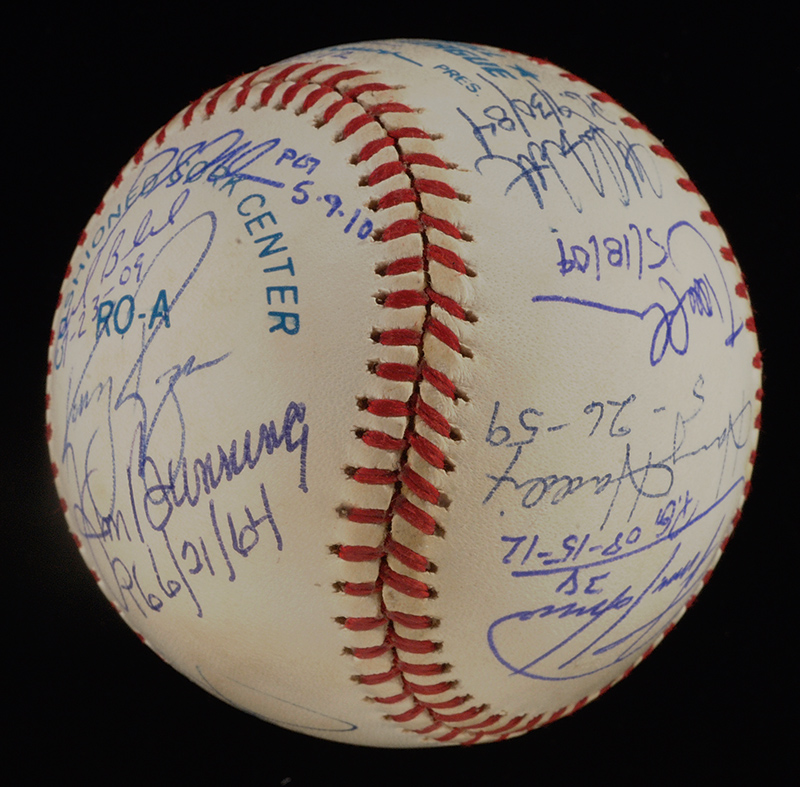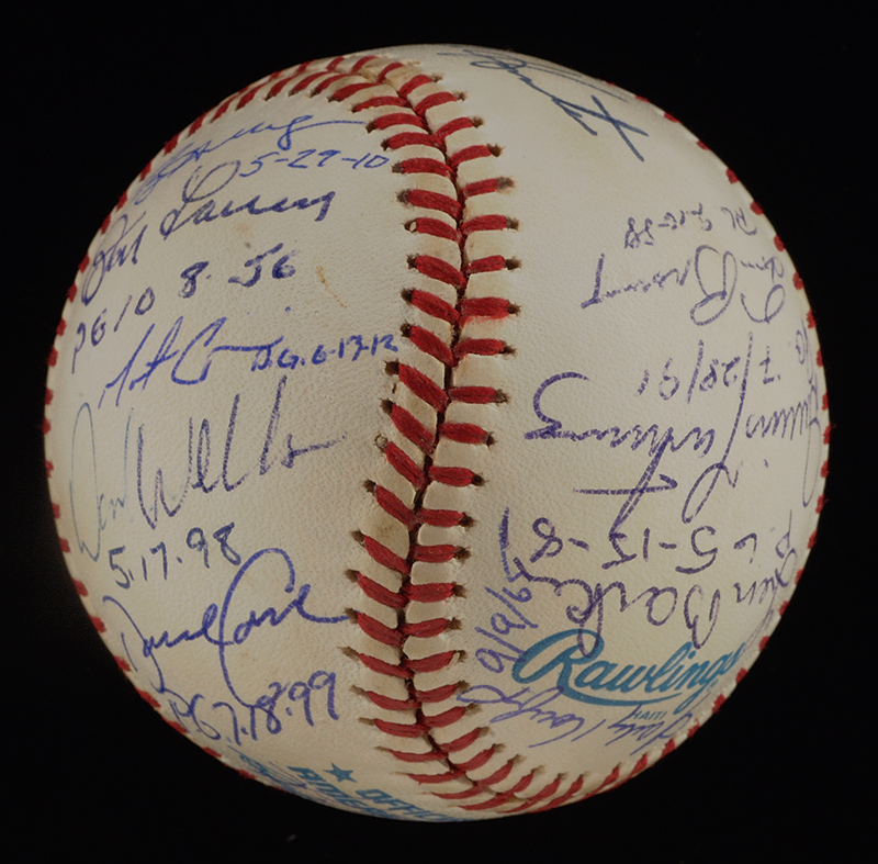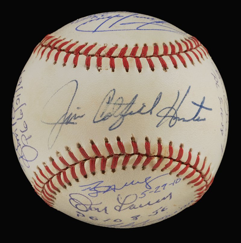 Description:Remarkable Perfect Game Pitchers autographed baseball with (19) signatures. Rare and highly desirable compilation of autographs representing every pitcher to have thrown a perfect game in the last (90) years. Rawlings B.Brown Official American League baseball has been signed by (19) incl. Koufax, Hunter, Johnson, Bunning, Haddix, Hernandez, Halladay, Larsen, Wells, Cone, Buehrle, Rogers, Braden, Witt, Humber, Cain, Barker, Martinez, and Browning. With the exception of Hunter and Rogers, each has inscribed their perfect game date. All are done in ink rating 7/8 to 8/9 out of 10. Touch of light scattered toning. Includes full LOA from PSA/DNA: EX/MT-NM