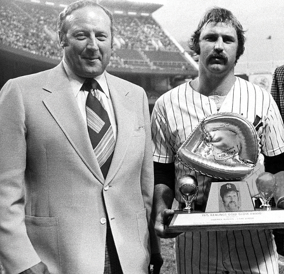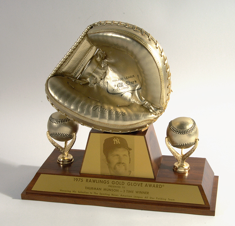 Description:1975 Thurman Munson Gold Glove award. Rare 1975 Thurman Munson Gold Glove Award. While Thurman Munson's accolades and accomplishments are often in relation to his clutch hitting and clubhouse leadership, defensive play was never a liability for Thurman. Along with Carlton Fisk and Johnny Bench, Thurman Munson was regarded as one of the finest defensive backstops of his era. Munson's impressive career defensive statistics clearly illustrate his prowess behind the plate in an everyday role for eleven years: .982 lifetime fielding percentage, 6253 putouts, and only 127 errors in nearly 1,300 career games. One of the legendary stories relating to Thurman's defensive career occurred during the 1971 season, in which he committed only one single error. As unbelievable as the statistic is, this error was not executed on a routine passed ball or errant throw, but because a runner knocked Thurman unconscious at home plate dislodging the ball. Munson was bestowed with the pinnacle of defensive accolades, the Rawlings Gold Glove Award, for three consecutive American League seasons, from 1973 through 1975. The offered award dates to the 1975 season with the award itself measuring an imposing 16" tall by 18" long. Wooden plinth style trophy base features applied brass placards with image of Munson and titling having crossed bat supports holding two gold painted baseballs. Trademark Rawlings gold painted "Major League" model catcher's mitt resides in the center. The award remains in superlative original condition with minimal age or surface wear. Hunt Auctions was honored to conduct the Thurman Munson Collection auction on behalf of the Munson family in 2008. This particular specimen was retained by the family and now joins his 1974 Gold Glove award (sold in 2008) as the only two examples having entered the marketplace. Very significant award from one of the most revered players of the 1970s era originating directly from Munson's personal collection. Includes letter of provenance from Diana Munson: NM