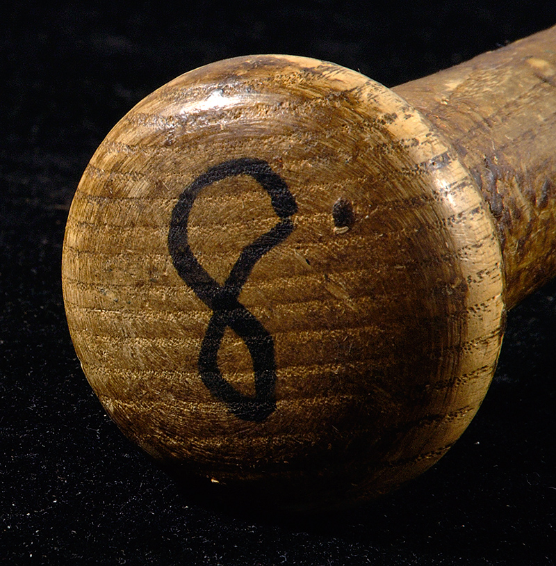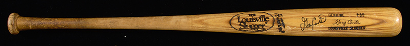 Description:Gary Carter autographed professional model baseball bat c.1985-86. Louisville Slugger 125 model P89 bat with Carter facsimile signature foil stamped on the barrel measures 35" long and weighs 31.6oz. Strong usage wear evident throughout including ball and contact marks along with grain swelling (the most extreme of which, on the back barrel, has been repaired). There is a healthy coat of pine tar on the handle which has a crack. Number "8" has been written on either end in black marker. Signed in marker rating 7/8 out of 10. Very nice example dating to the Mets Championship era. Includes auction LOAs from JSA (autograph) and LOAs from Hunt Auctions and John Taube: EX