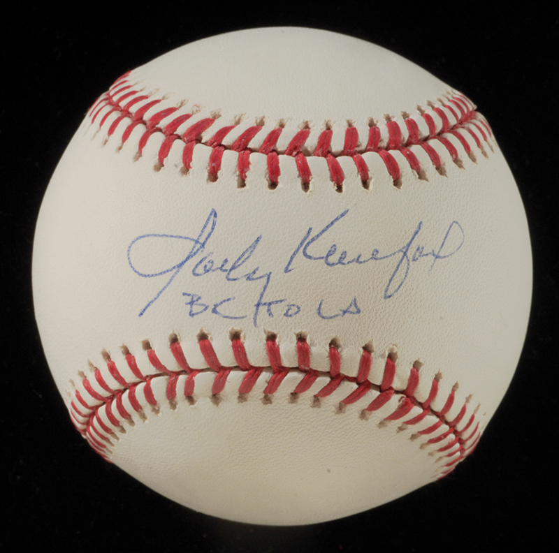 Description:Sandy Koufax single signed and inscribed baseball. B.Selig MLB ball signed by Koufax in blue ink across the sweetspot with "BK to LA" inscription. Signature rates 8 out of 10. Includes auction LOA from JSA and has Steiner hologram attached: NM