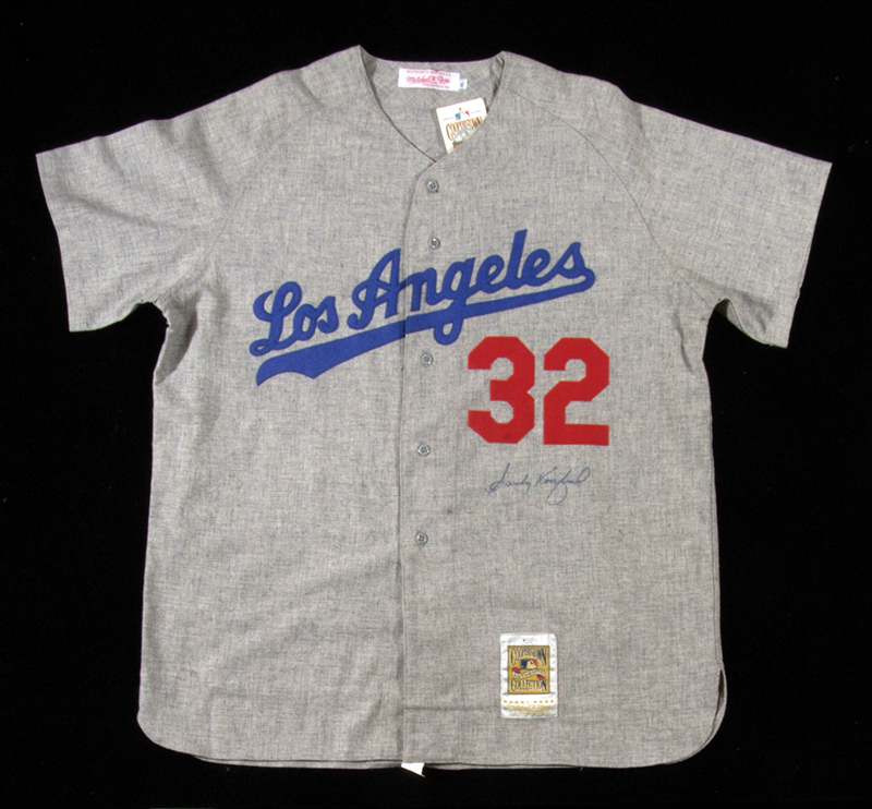 Sandy Koufax autographed Los Angeles Dodgers replica jersey. Grey flannel Mitchell & Ness Los Angeles Dodgers replica jersey having been signed across the front in blue sharpie. Includes auction LOA from JSA: NM