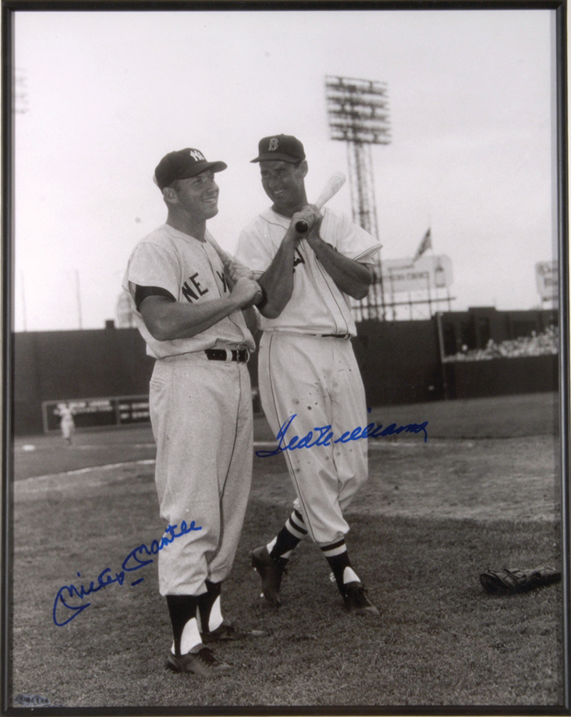 Description:Mickey Mantle and Ted Williams autographed photograph (UDA). Choice black and white photograph has been signed by each in marker rating 9-9/10 out of 10. Framed to 24.5"x28.5" (light wear to frame). Includes COA from Upper Deck Authentication: NM/MT