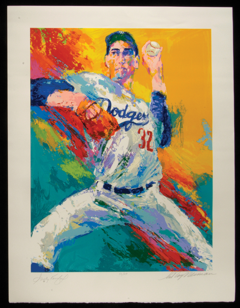 Description:Sandy Koufax autographed limited edition serigraph by LeRoy Neiman. Striking color serigraph is hand numbered out of (359) pieces and signed "Sandy Koufax" and also by artist "LeRoy Neiman" at the bottom margin in pencil. Signatures rate 9-9/10 out of 10. Measures 30"x39" and has long been stored rolled with no mentionable wear: NM