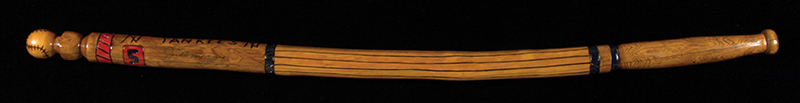 Description:Mickey Mantle and Joe DiMaggio autographed hand carved walking stick. Walking stick carved from a 39" long section of wood has a baseball decoration which serves as the handle. Just below is "Yankees" team name and "NY" logo along with numbers "5" and "7." It has been signed, to the right of their respective numbers, by "Joe DiMaggio" and "Mickey Mantle No.7." Marker signatures rate 7/8-8 out of 10. Includes auction LOA from JSA: Sigs. EX/MT-NM, Stick EX