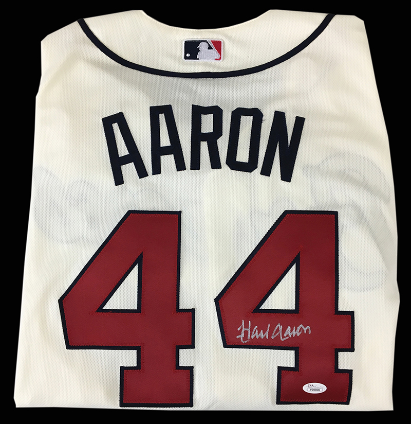 Hank Aaron autographed Atlanta Braves replica jersey. Cream color home knit style replica jersey signed by Aaron in silver sharpie across the back. Signature rates 9 out of 10. Includes JSA sticker affixed to the reverse: NM