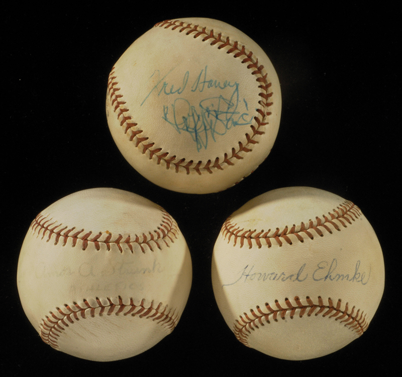 Description:Lot of (3) signed baseballs incl. Amos Strunk and Howard Ehmke single signed. Trio of J.deBeer and Son brand "Semi-Pro League" baseballs incl. single signed Howard Ehmke (7/8 out of 10); single signed Amos Strunk inscribed "Athletics" (5/6); and dual signed Duffy Lewis and Fred Haney (8). Touch of light toning/wear to balls. Includes auction LOA from JSA: Balls EX/MT, Sigs. GD-NM