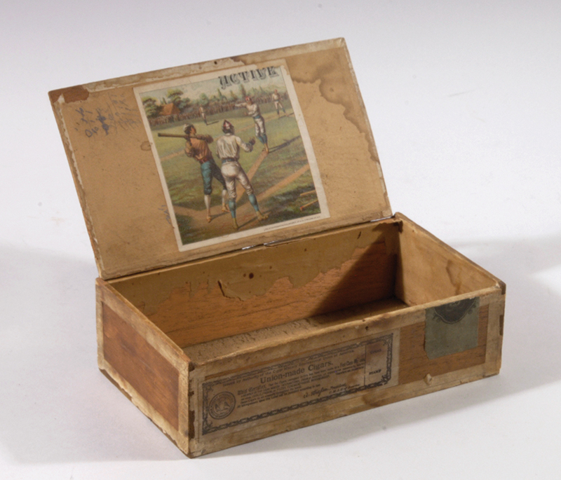 Description:"Active" baseball decorative cigar box c.1880-90s. Mahogany wooden lidded box displays a single interior color lithographic label depicting a 19th century baseball game scene. The lid is detached at the hinge area from the box and overall use/handling wear is visible throughout the box: GD-VG