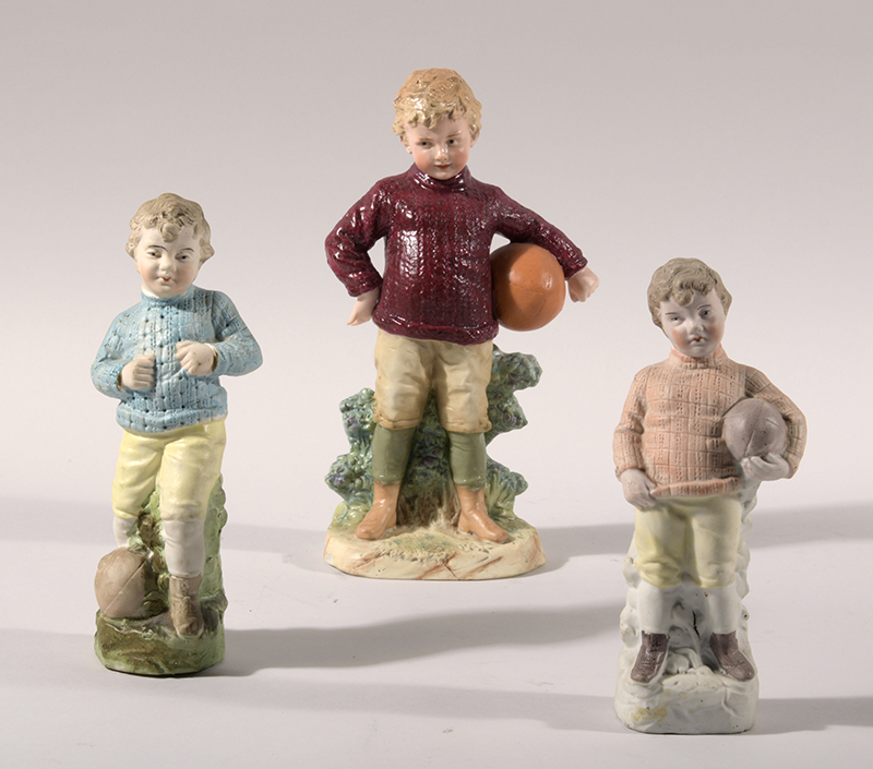 Description:Lot of (3) Heubach football porcelain figurines c.1880-1900. Includes 10" tall uniformed player holding melon style football and a matched pair of 8" tall uniformed players each with melon style ball. All three retain their original manufacturer's stampings with minimal age wear: EX/MT-NM