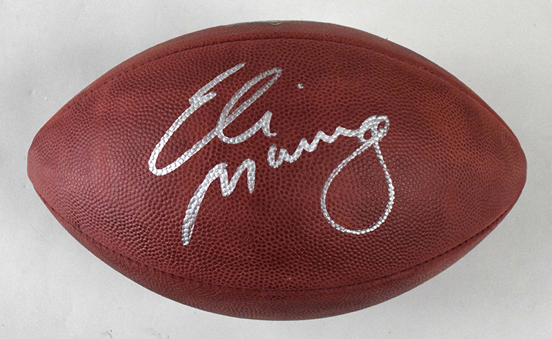 Description:Eli Manning autographed authentic NFL football. Wilson "The Duke" NFL football signed by Manning in silver marker. Signature rates 9 out of 10. Includes NFL Auction COA from PSA/DNA (matching serial #ed sticker is affixed to the ball): NM/MT