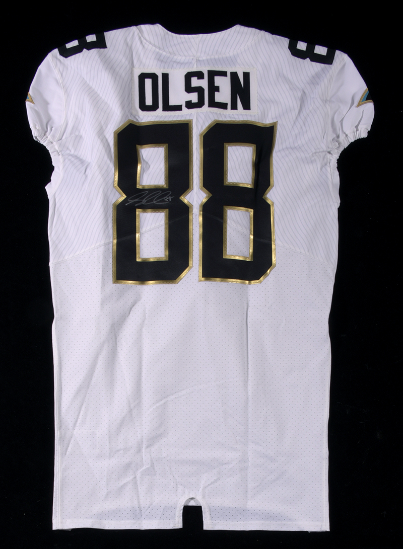 Description:Greg Olsen autographed 2016 game issued Pro Bowl jersey. Nike size 46 #88 Greg Olsen jersey with proper On Field tagging inside the collar. Olsen signed the jersey in silver marker rating 8/9 out of 10. Includes NFL Auctions COA from PSA/DNA, with matching serial #ed sticker affixed to the jersey. Shows no signs of use/wash wear: NM